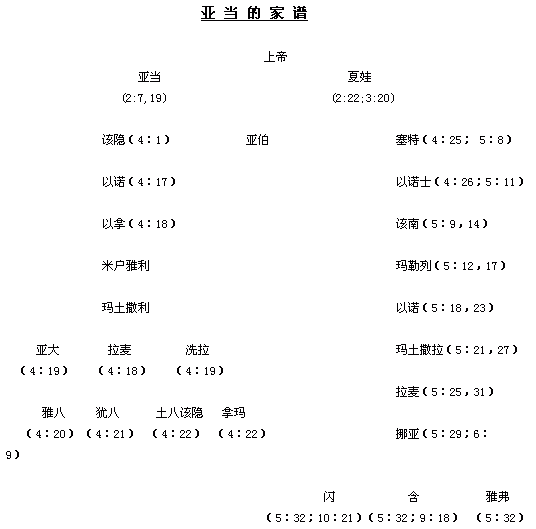 《创世记》4~6章记录了亚当和夏娃得罪上帝与上帝分离后,罪状渐渐严重的过程,罪恶在第四章中首先渗透到家庭,第五章渗入社会,第六章渗入全世界。