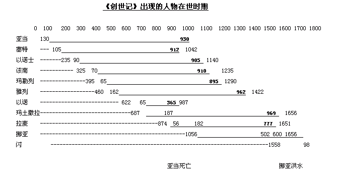 此图表说明《创世记》出现的几个人的在世时期,细线连接的前后的黑体数字是出生和死亡的年代,宋体数字是人的寿命。