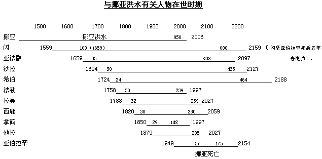 洪水以后,人的寿命和生第一胎的年龄明显减少。除挪亚家族以外的所有人都被淹死了。最长寿命的玛土撒拉活到九百六十九岁;挪亚在自己第十代子孙他拉一百二十八岁时结束自己九百五十岁的生命;挪亚的儿子闪在他拉二百七十八岁时去世,活了六百岁。从图表中可以看到与九百多岁的挪亚和洪水以前的人相比,闪活到六百岁、希伯活到四百六十四岁、亚伯拉罕活到一百七十五岁;雅各活到一百四十七岁;约瑟活到一百一十岁,洪水以后的寿命急剧减少。